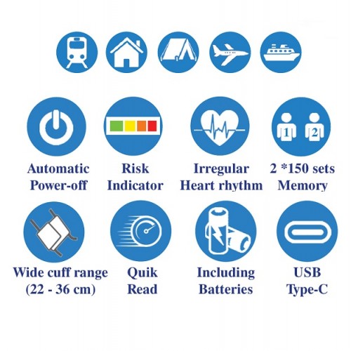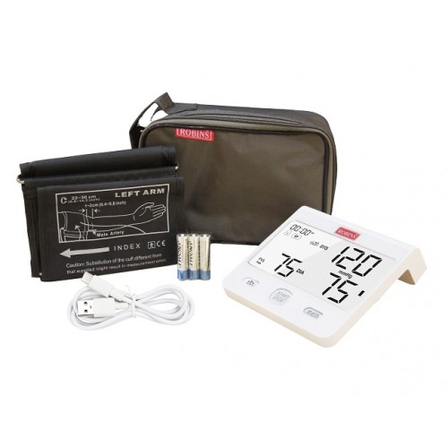 ROBINS RM - 80 blood pressure monitor حفظ ميموري لشخصين يعمل على البطاريات ووصلة الشحن الكفة قياس كبير من 22-36 سم اشارات تحذيرية بالالوان تنبيه عدم انتظام نبضات القلب سرعة في القراءة بضاريات + ووصلة شكل كلاسيكي امكانية قياس الضغط على المرتفعات (طيارة) (متوفر)